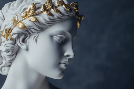 White antique statue of an attractive woman is wearing golden laurel wreath crown