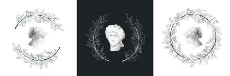 Vector olive wreath illustration with antique Greek god statue. Set of Mediterranean berries, green leaves, flowers, buds, and branches.