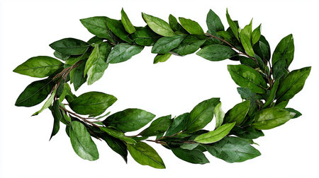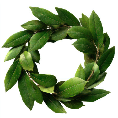 A stunning laurel leaf wreath, beautifully arranged and isolated on a white background. Perfect for decorations, crafts, or adding a touch of nature to your projects.