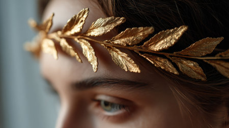 Close-up of a model wearing a golden laurel headband with soft lighting, highlighting classical beauty and timeless fashion