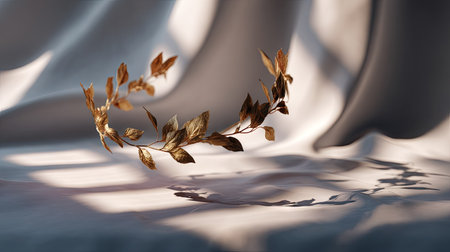 Golden laurel wreath on a mirror surface reflecting soft warm lighting, enhancing shine and dimension