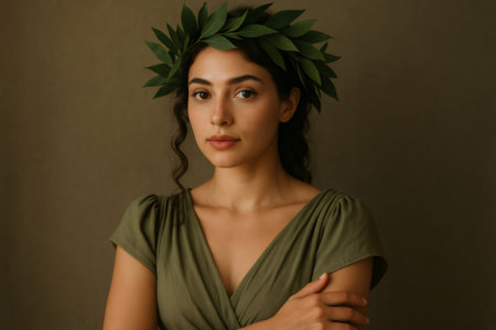 Studio portrait of a woman wearing a laurel wreath, symbolizing achievement, victory, and status, with arms crossed, exuding confidence