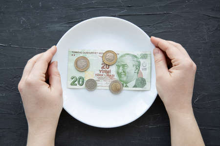 Money spend on food concept in Turkey on black backgorund. Turkey lira plate.