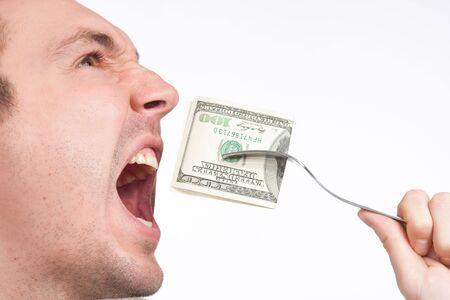 Man eating banknote, symbolising consumerism. Financial difficulties, share the money. Crisis, insolvency, recession concept.
