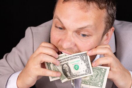 Greedy businessman biting dollar bill in dramatic portrait