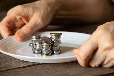 a stack of coins on a white plate on an old wooden table and old female hands poured a plate at home in the kitchen