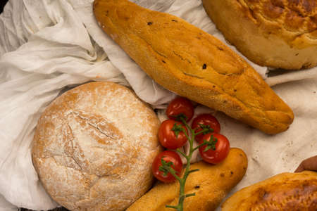 Conceptual art photography of a different kinds of bread and cherry tomato branches wrapped in white cloth. Copy space. Advertising, cooking, bakery and commercial design.