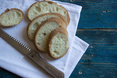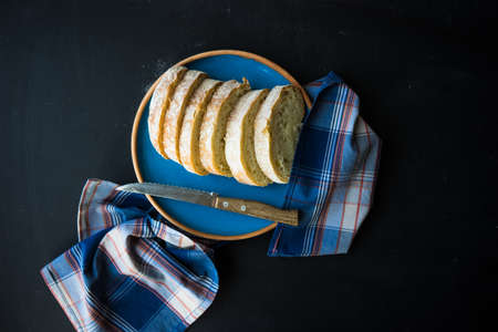Top view of fresh homemade bread cut into slices on rustic blue table with space for text