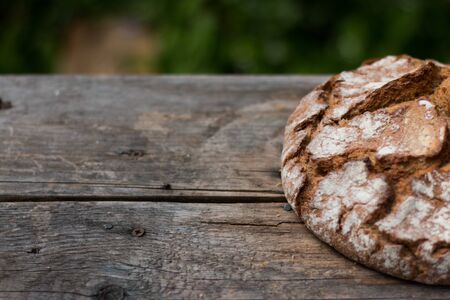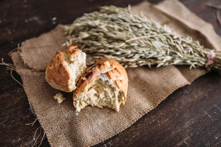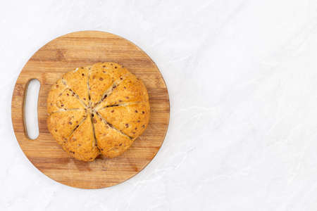 top view of round bread. Delicious fresh cornbread with sprinkles on an old wooden table. Copy space. Traditional recipes. Handmade bread.