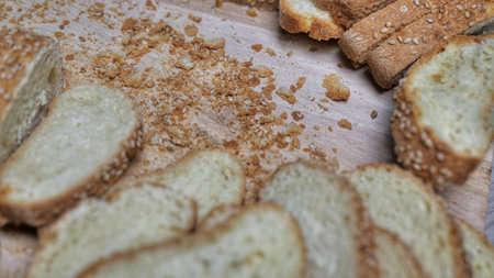 Detailed shot of a sliced loaf of bread with a soft interior and crispy crust, arranged on a white surface with crumbs scattered around.