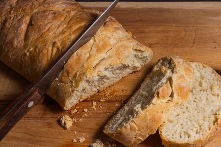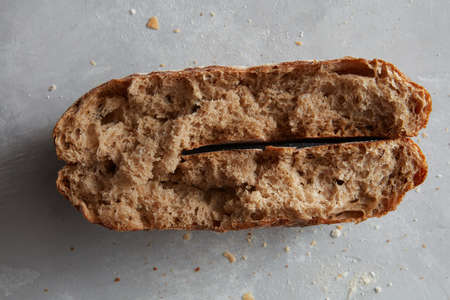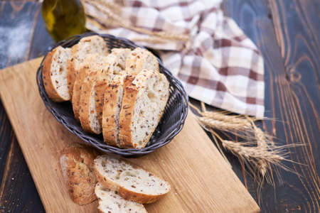 Close image of sliced rye bread with crispy crust. Fresh bread on kitchen table. Selective focus