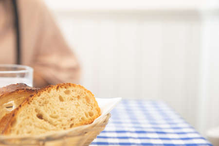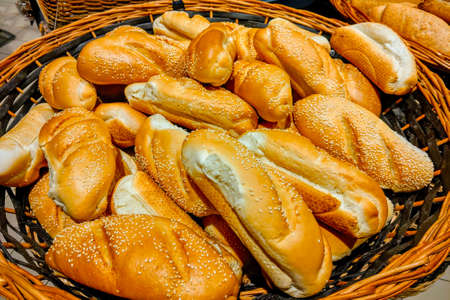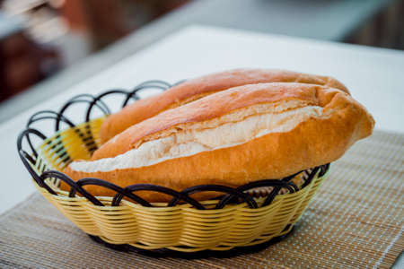 Mixed bread in basket isolated on the table for breakfast, lunch or dinner at home or cafe restaurant.