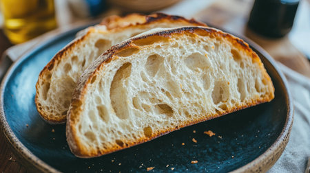 A close-up of two slices of freshly baked sourdough bread resting on a rustic plate, accompanied by olive oil. Perfect for culinary inspiration.