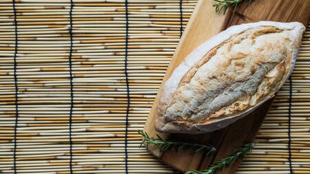 Homemade loaf of bread with packing paper and boxwood on the bottom of stone background