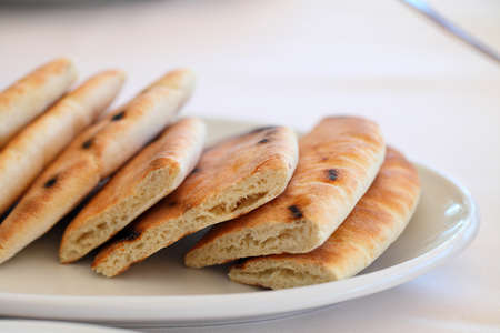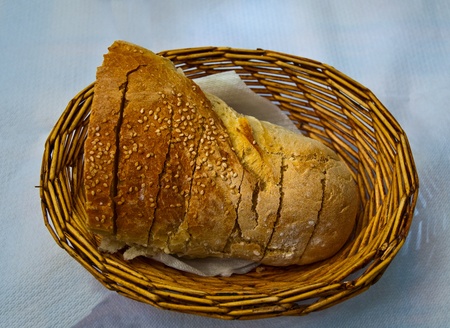 Fresh bread on the table. In background of the Mediterranean Sea in a Greek tavern.