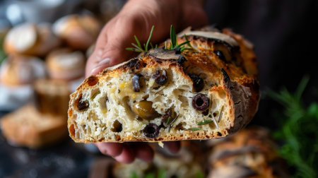 A hand holding a slice of freshly baked olive and herb bread with chunks of olives and fragrant herbs peeking through the crust