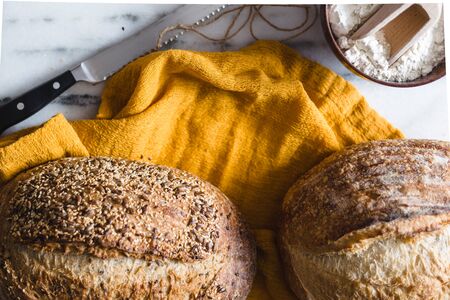Homemade wheat bread with flax seeds. The concept of homemade bread and healthy food. Top view. Flat lay.