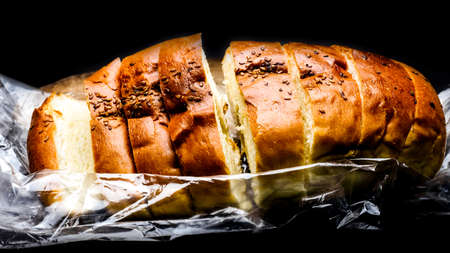 Wholegrain sliced freshly baked bread with flax and sesame seeds on black background. Side view.