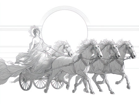 An illustration depicts a woman driving a chariot pulled by four horses. The artwork utilizes a black and white color scheme with detailed linework. A large sun silhouette is visible overhead. The image is suitable for various commercial purposes, including editorial content and design projects.