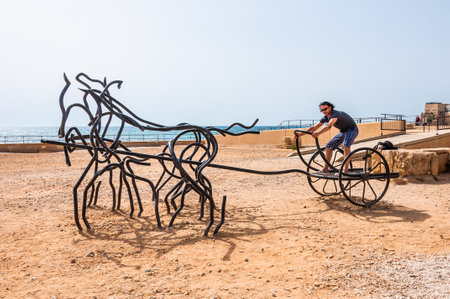 Caesarea, Israel - May 22, 2012: Tourist man standing on modern sculpture of Roman Horse Chariot made of black bent forged metal stand on ancient Caesarea beach where long time ago was hippodrom