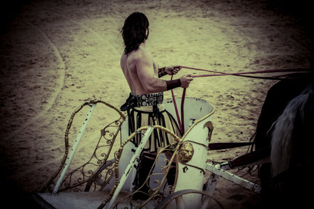 Warriors, Roman chariot in a fight of gladiators, bloody circus