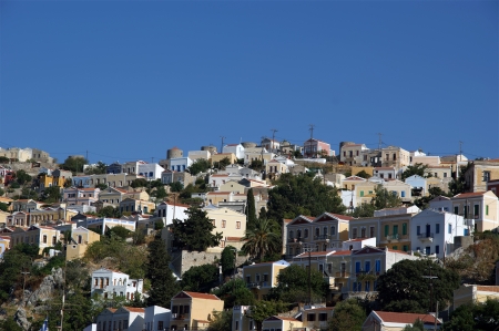 Symi village on island of Symi near island of Rhodes (Greece). Typical greek houses