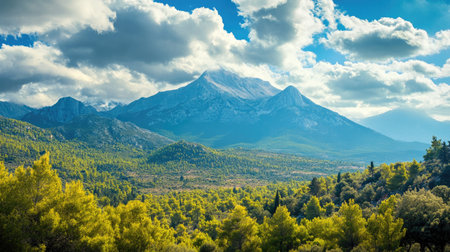 A tranquil view of Mount Olympus in Greece, with ancient forests and plenty of space for copy