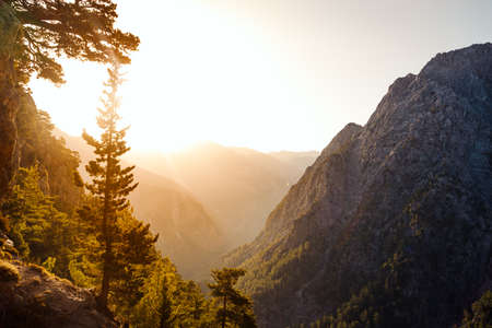Samaria gorge forest in mountains pine fir trees green landscape background