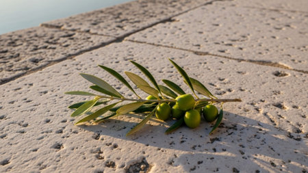 A wide, cinematic environmental shot (16:9) capturing a single olive branch placed on a large, textu