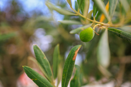 Olives ripen on the tree. Selective focus with blurred background and copy space for text