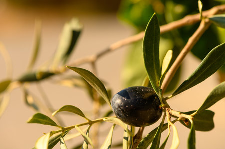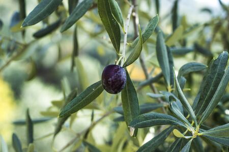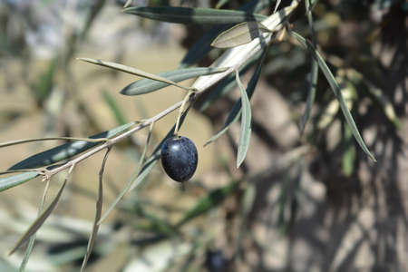Black olives tree background, closeup photo of a branch with ripe black olive berries on it, olive production, autumn harvest season