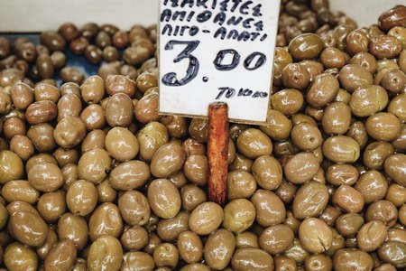 Green olives for sale at the Athens Central Market in Greece. Containers with olives and price tag. Translation: green olives