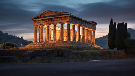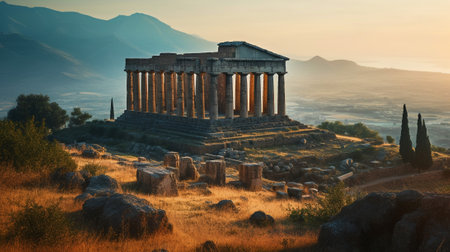 Panorama of Ancient temple ruins at sunset, remains of old Greek building on beautiful sky background. Concept of antique, Greece, landscape, travel, history. Generative AI