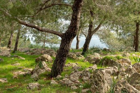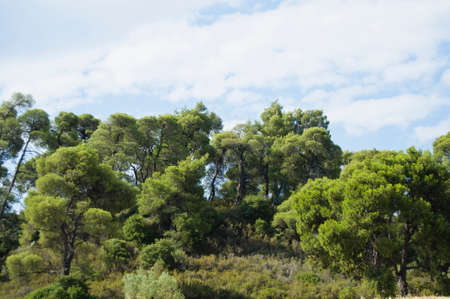 Beautiful landscape with turkish pine, sea in the background and nice blue sky with clouds. Green pinus brutia with flat crowns and bent trunks look enormous.