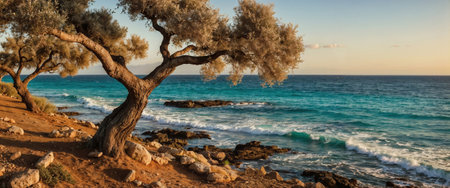 Scenic view of the mediterranean sea at sunset with an olive tree growing on the rocky coastline.