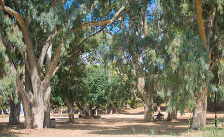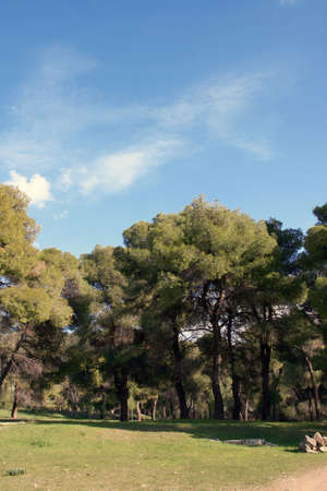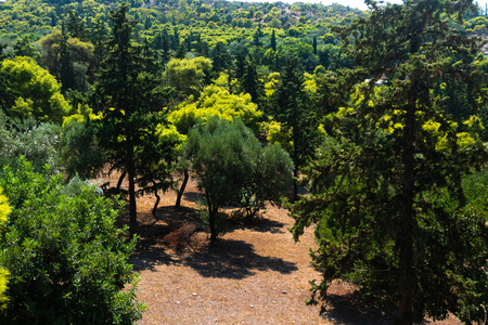 Shady park of green silver firs at the foot of the ancient Acropolis on a hot summer day. Athens, Greece.