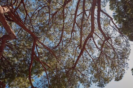 Pine tree sunbeams through branches against clear blue sky concept. Coniferous evergreen plant with needles, foliage cover the sun, fresh flora healthy organic background. Nature template, under view.