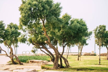 The winter sunset cast long shadows on the green grass. Israel, warm January day. Picturesque paths among the pines, bent by the sea wind