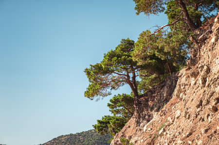 Pine tree on rocky landscape blue sky background. Branch with bright green needle, Mediterranean flora, evergreen coniferous wild plant sunny day.