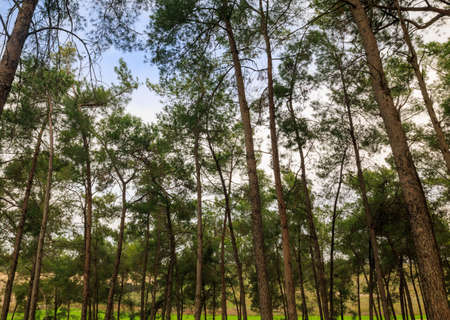 Many Pine trees going up in forest with sunrise.Copy space in middle.