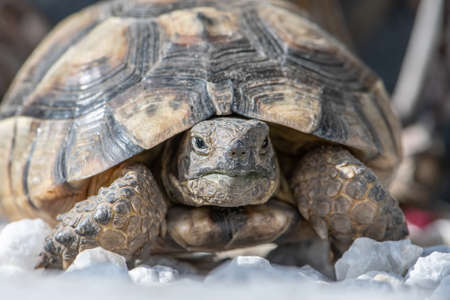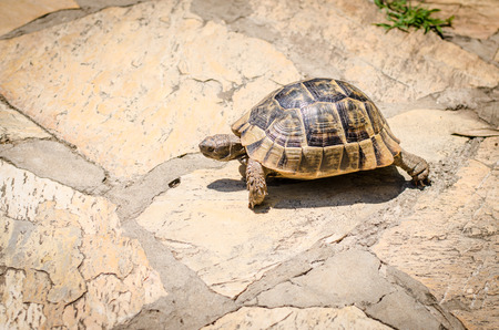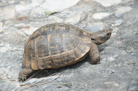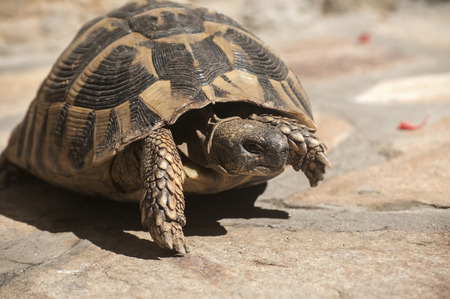 Hermann's tortoise walking on stone surface closeup