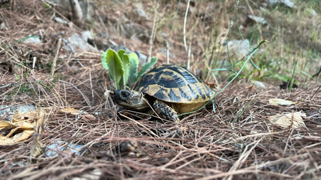 Close up of a young Greek turtle in its natural environment - macro, selective focus, space for text