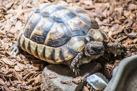 Central Asian tortoise inside a terrarium in the afternoon