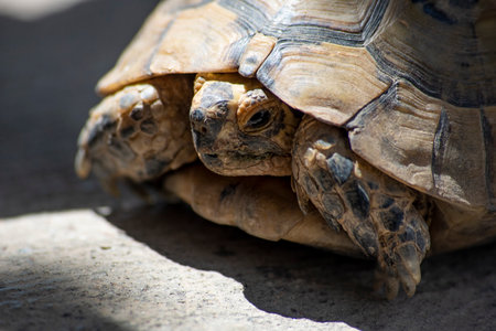 Close-up portrait of a Mediterranean land turtle on a sunny day.