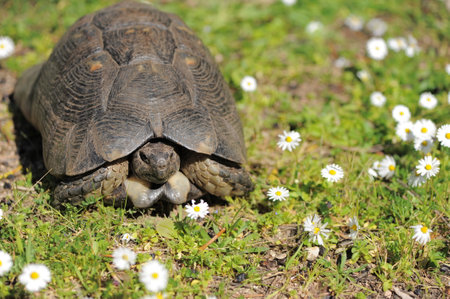 Big spur thighed turtle (Testudo graeca) standing in the sun on a green background, Macin Mountains, Dobrogea