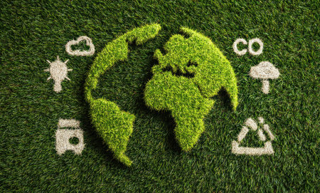 An overhead view presents a green Earth globe crafted from grass, set against a grassy background. Surrounding the globe are white environmental icons symbolizing sustainability. The composition features vibrant green and white hues, suggesting ecological themes. Suitable for educational materials, website designs, or illustrating environmental concepts.