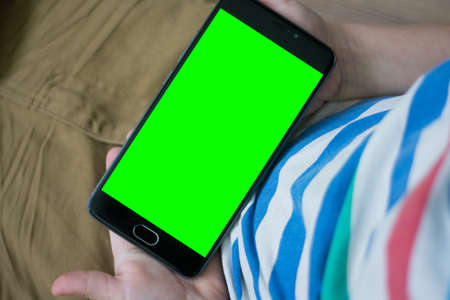 mobile screen in chroma green and used by young hands for any application