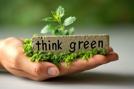 A person holding a sign that says think green. Text think green.