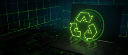 Recycle tech green glowing above laptop 3D Render