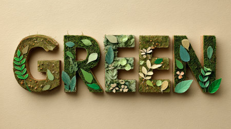 Green word made of moss and leaves on beige background with natural texture and eco concept